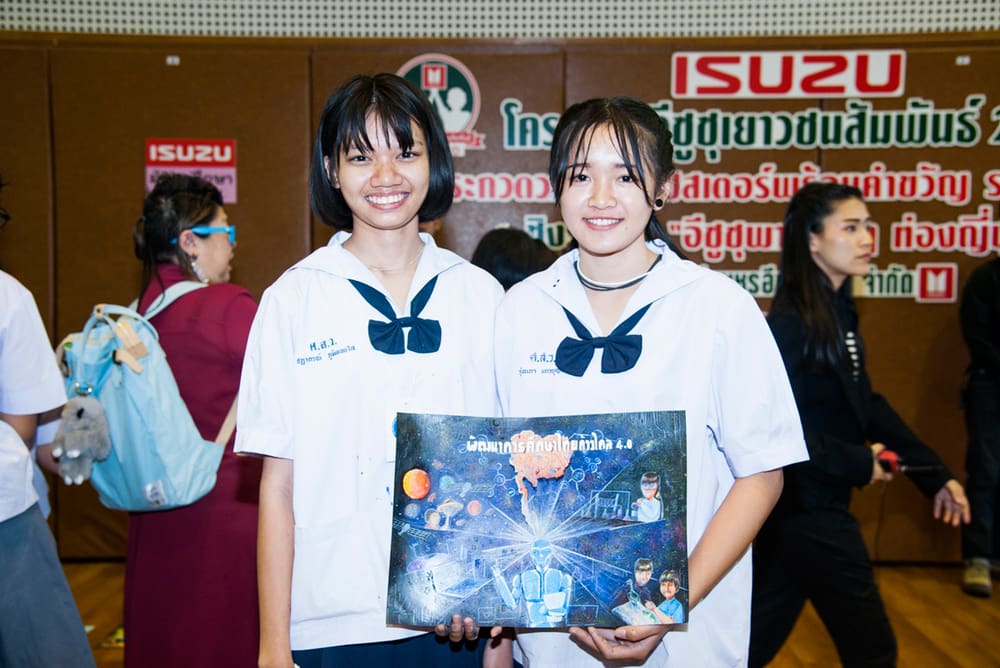 และอีกทีมจากโรงเรียนเฉลิมขวัญสตรี จังหวัดพิษณุโลก นางสาวธันยมัย เซี่ยงว่อง และนางสาวขวัญพร พิศุทธานันท์ กล่าวถึงความรู้สึกในการแข่งขันว่า “ตื่นเต้นมากค่ะ เพราะเป็นการวาดภาพสดภายในเวลาที่กำหนด แต่พวกเราก็ทำสมาธิและวาดรูปได้จนเสร็จตามตั้งใจได้ภายในเวลา 3 ชั่วโมง เราแบ่งงานกันในส่วนที่แต่ละคนถนัด ทั้งร่างแบบภาพ ออกแบบตัวหนังสือ จนลงสีเสร็จสิ้น ปีนี้หัวข้อยากนิดนึงค่ะ เพราะเป็นเรื่องใหม่ของสังคม ต้องมีปรับแผนงานเหมือนกันหลังจากที่ประกาศหัวข้อ แต่พวกเราก็ทำเต็มที่ค่ะ อยากให้เพื่อน ๆ ที่ชอบศิลปะเข้ามาพิสูจน์ความสามารถกับโครงการอีซูซุเยาวชนสัมพันธ์กันดูนะคะ เพราะได้ประสบการณ์เยอะ มีความท้าทายและตื่นเต้นด้วยค่ะ”