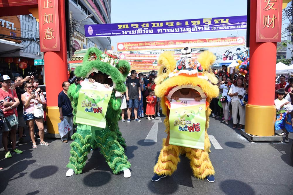 สำหรับบรรยากาศตรุษจีนปีจอมงคลที่ย่านเยาวราชเป็นไปอย่างคึกคักด้วยขบวนแห่สิงโตมอบโชคพร้อมแจกอั่งเปา นำทีมโดยบอสใหญ่ บุษยา สถิรพิพัฒน์กุล แห่ง เอไอเอส ชวนหนุ่มฮอต พุฒ-พุฒิชัย ที่งานนี้ทุ่มสุดตัวโชว์ลีลาเชิดสิงโตเซอร์ไพรส์แฟนคลับเรียกเสียงกรี้ดสนั่นไปทั้งถนนเยาวราช ส่วน 2 สาวหมวย เต้ย-จรินทร์พร และรถเมล์-คะนึงนิจ ก็ไม่น้อยหน้าพร้อมใจกันแจกอั่งเปาแบบรัวๆ ก่อนจะควงกันไปชิม ความอร่อยร้านเด็ด ไม่ว่าจะเป็น ร้านเซี้ย หูฉลาม, ร้านเจ๊สอนกระทะร้อน, ร้าน Sweettime, ร้านยู้ ก๋วยเตี๋ยวลูกชิ้นปลา และร้านเด็ดๆ อีกกว่า 100 ร้านค้า พิเศษสุดสำหรับลูกค้าเอไอเอส ลิ้มความอร่อยกันแบบฟรีๆ กับแคมเปญ “มื้อนี้ฟิน วันนี้ฟรี” ที่จัดต่อเนื่องตลอดทั้งปี ประเดิมที่เยาวราชเป็นแห่งแรก