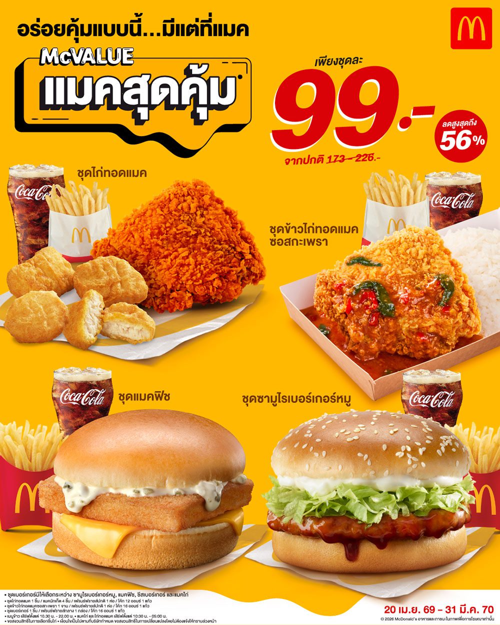อร่อยคุ้มแบบนี้ มีแต่ที่แมค! กับ ‘แมคสุดคุ้ม’ ทางเลือกที่คุ้มค่าเพื่อลดภาระค่าครองชีพคนไทย ตั้งแต่วันนี้ถึง 31 มีนาคม 2570 ที่ร้านแมคโดนัลด์ทุกสาขาที่ร่วมรายการ, แมคไดร์ฟ ทรู และแมคดิลิเวอรี โทร.1711, เว็บไซต์ www.mcdonalds.co.th ติดตามรายละเอียดเพิ่มเติมได้ที่ Facebook.com/McThai