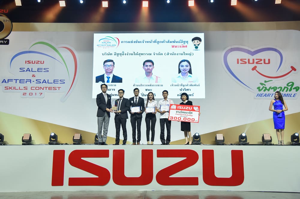 รางวัลชนะเลิศ ทีมเจ้าหน้าที่ลูกค้าสัมพันธ์อีซูซุ ได้แก่ คุณองอาจ พุ่มเงินพุ่มทอง (ด้านการขาย) คุณชนะ ปิ่นฑะศิริ (ด้านบริการหลังการขาย) และ คุณปวริศา กลิ่นจันทร์ (เจ้าหน้าที่ลูกค้าสัมพันธ์) จากบริษัท อีซูซุอึ้งง่วนไต๋สุพรรณ จำกัด (สำนักงานใหญ่) รับเงินรางวัล 300,000 บาท โล่เกียรติยศและประกาศนียบัตร