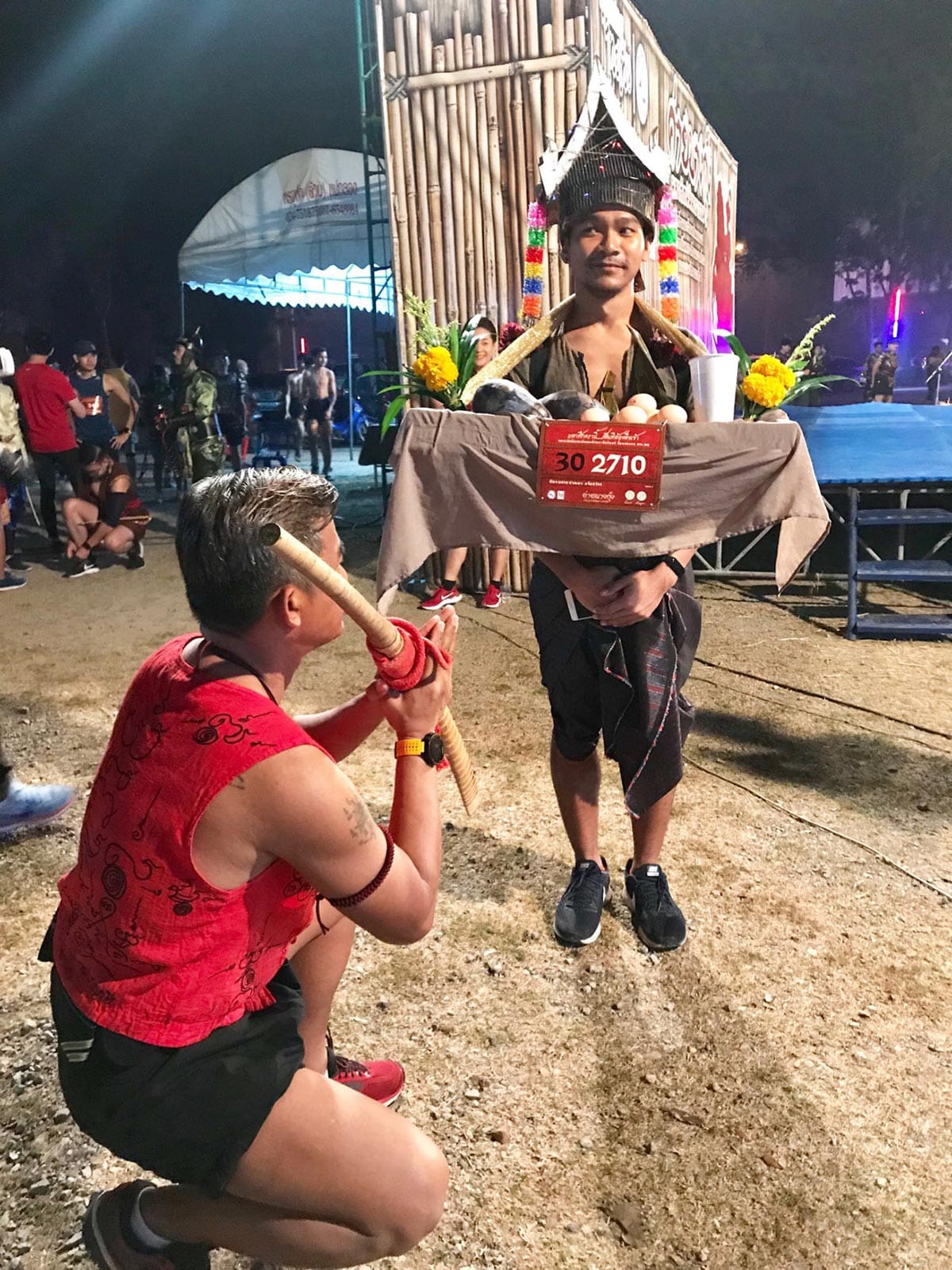 นายจิรศักดิ์ อ่วมอุไร ผู้อำนวยการการท่องเที่ยวแห่งประเทศไทย สำนักงานสมุทรสงคราม ได้ร่วมลั่นกลองรบแบบโบราณ เพื่อปล่อยตัวเหล่านักวิ่งผู้กล้าค่ายบางกุ้งทั้ง 3 ระยะ คือ มินิมาราธอน 13 กิโลเมตร รุ่นฟันรัน 5 กิโลเมตร และเดินเพื่อสุขภาพ 3 กิโลเมตร กล่าวถึงการจัดงาน “ค่ายบางกุ้งมินิมาราธอน ครั้งที่ 2” ว่า งานวิ่งค่ายบางกุ้งมินิมาราธอน ในปีนี้ เราได้รับการตอบรับจากเหล่านักวิ่งกว่า5,000 คน ซึ่งเพิ่มขึ้นจากปีแรก ด้วยพลังศรัทธารวมถึงเสียงชื่นชมในรูปแบบการจัดงาน ปีนี้ นอกจากเหรียญรางวัล และถ้วยรางวัลแล้ว เรายังออกแบบตุ๊กตาควายอาคมจงรักจงหลงมาเป็นรางวัลให้กับนักวิ่งผู้กล้าได้สะสมอีกด้วย และเรียกได้ว่า งานนี้เป็นงานรวมเหล่านักรบทุกสายพันธ์ ทุกเชื้อชาติ จากการพร้อมใจกันแต่งกายของเหล่านักวิ่ง ที่มาร่วมสร้างสีสันและบรรยากาศให้สนุกยิ่งขึ้น
